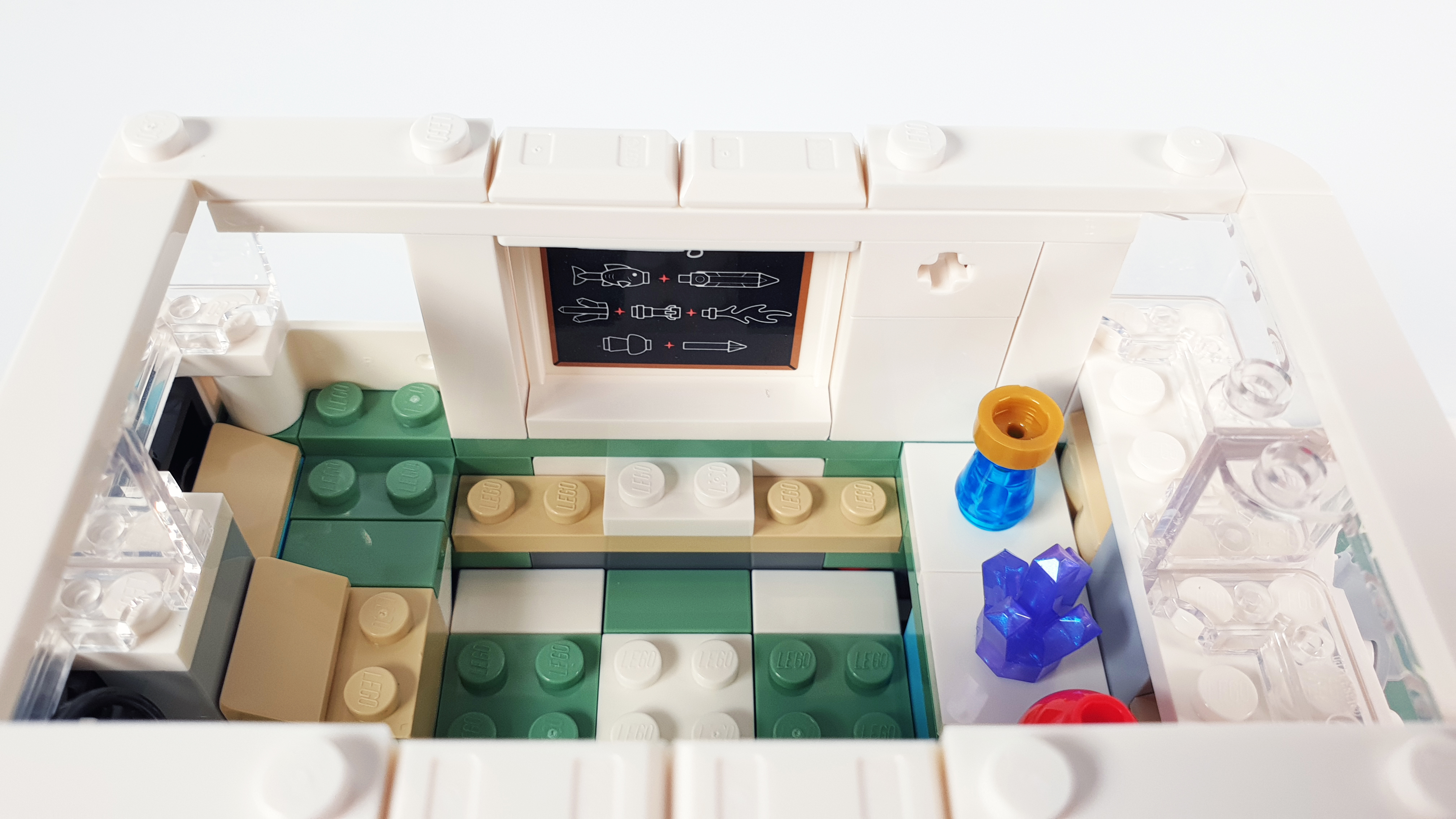내부 벽면에는 칠판 같은 것이 있는데 여러 브릭을 이용해 무기를 만드는 설계도가 그려져 있네요.