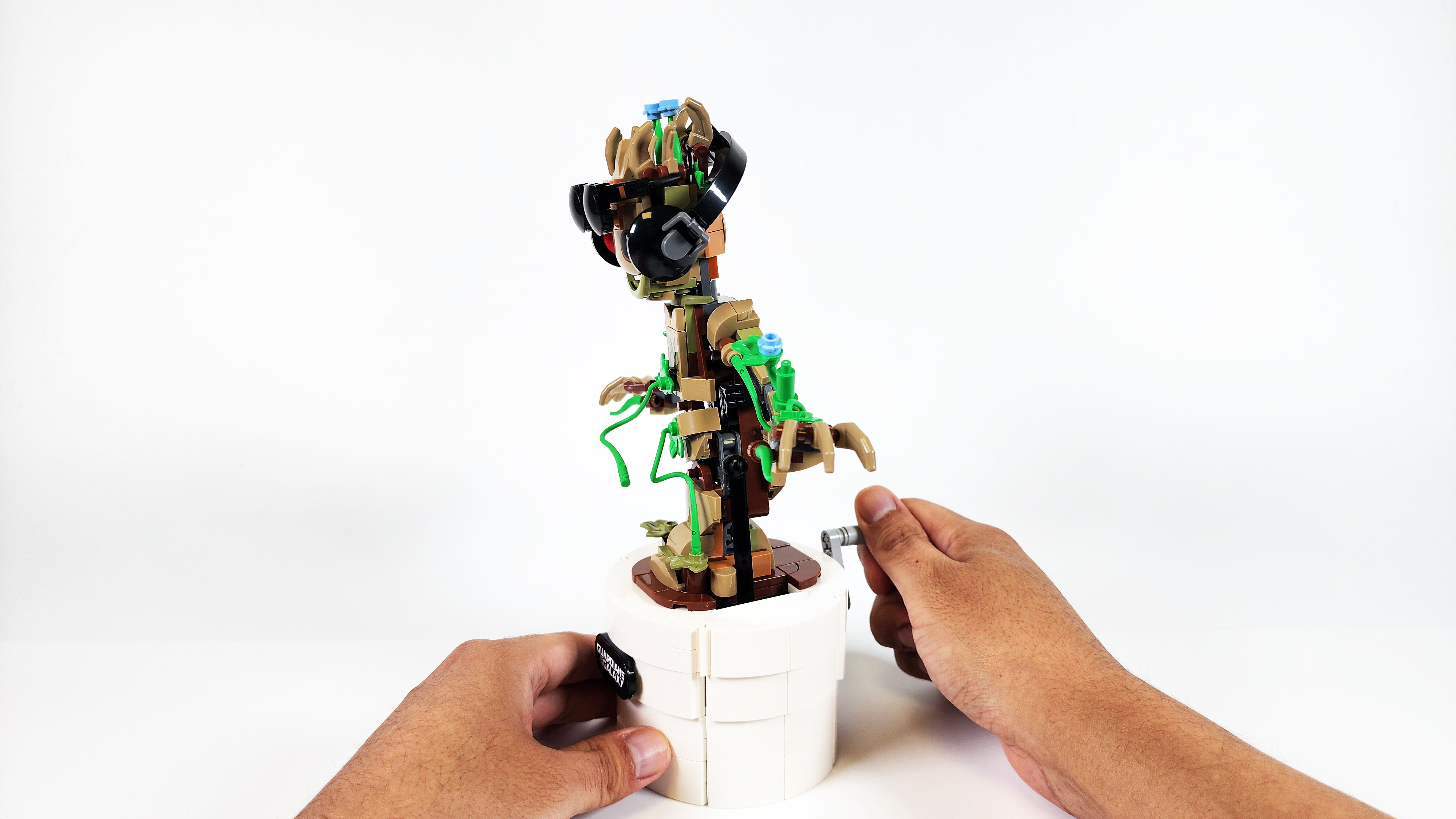화분 뒤에 있는 레버를 돌려주면 좌우로 흔들흔들 그루트가 춤을 춥니다.